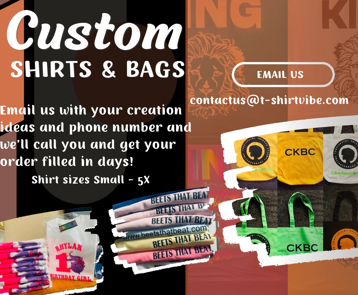 Email us with your interest and phone number and someone will call you to create something special just for you! Email: contactus@t-shirtvibe.com